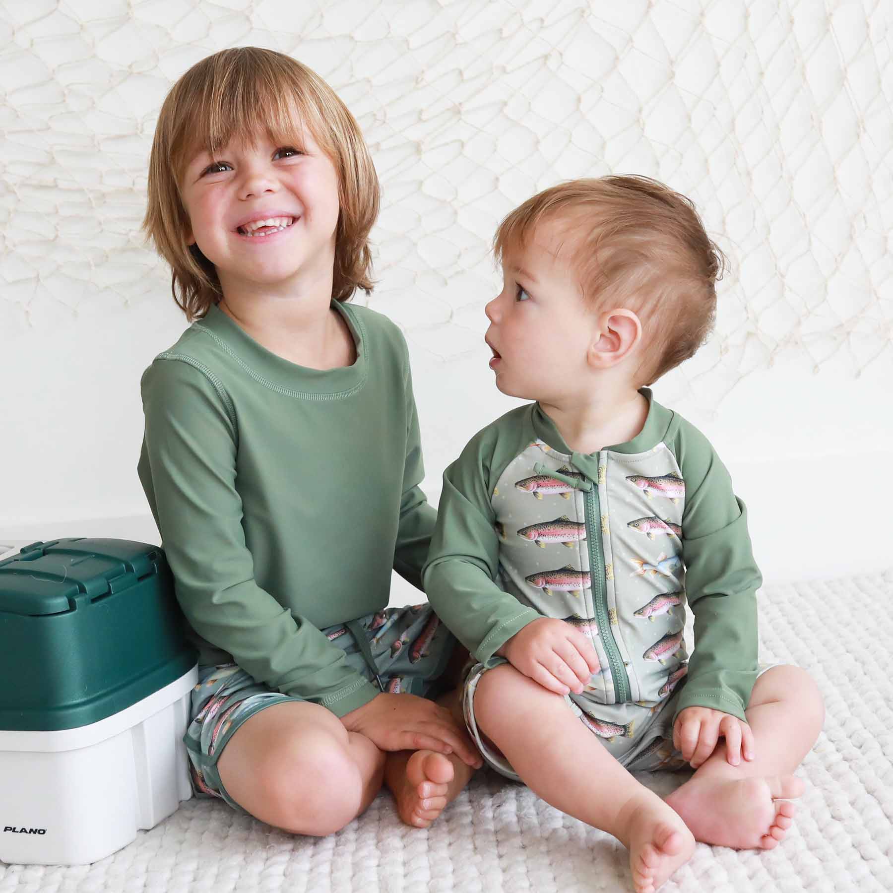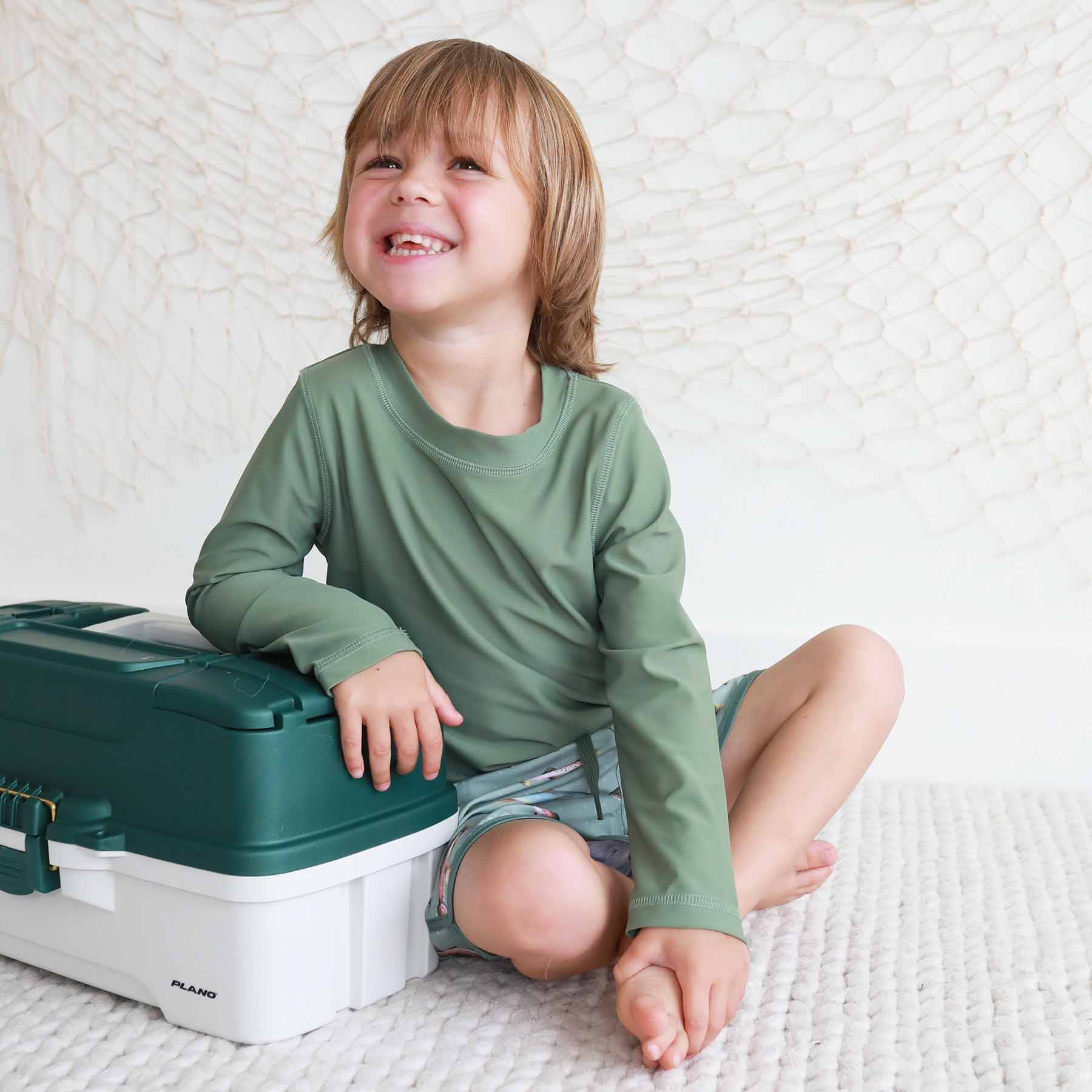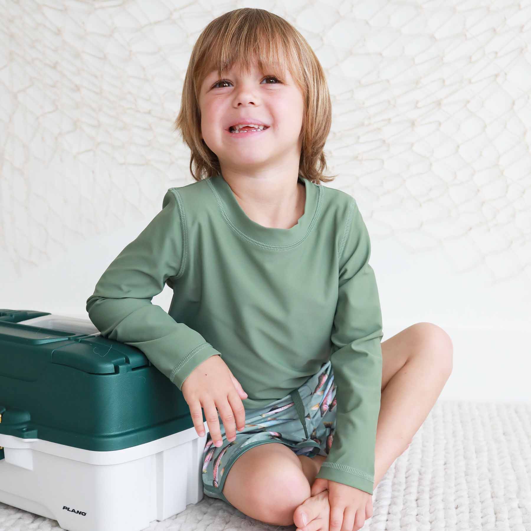 Made from UPF 50+ fabric that blocks 98% of the sun's harmful UVA & UVB rays, this long sleeve rash guard shirt is your little angler's first and only line of defense needed to be protected from the sun! Coming in a dark moss green color that perfectly matches our "Freshwater Friends" swim trunks, this will be a rash guard shirt that your little one will be excited to put on for every fishing adventure or trip to the beach. This silky smooth rash guard will be a swim shirt that your little fisherman will love to slip on before all of his water adventures, minimizing fighting over sunscreen and maximizing time spent in the sun!