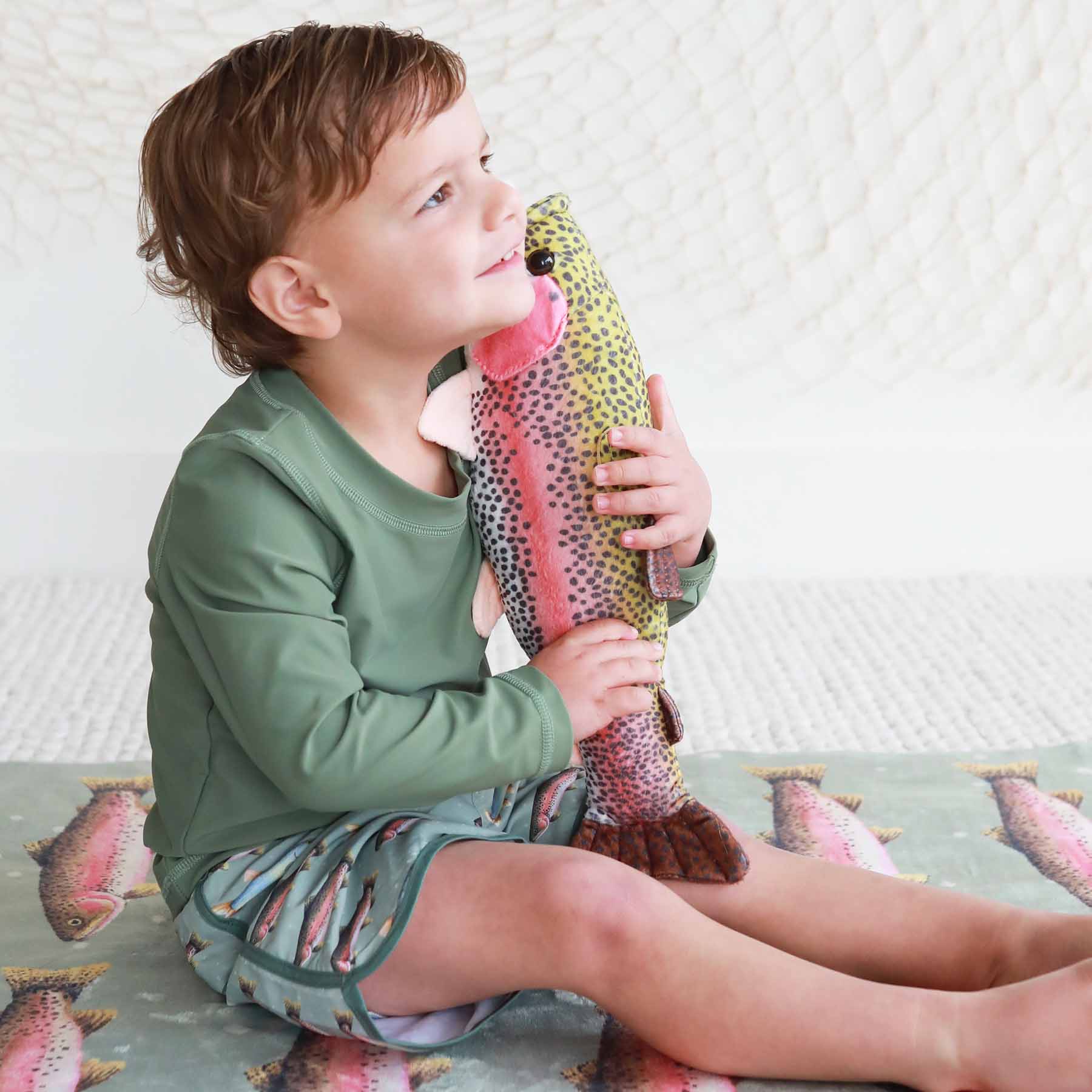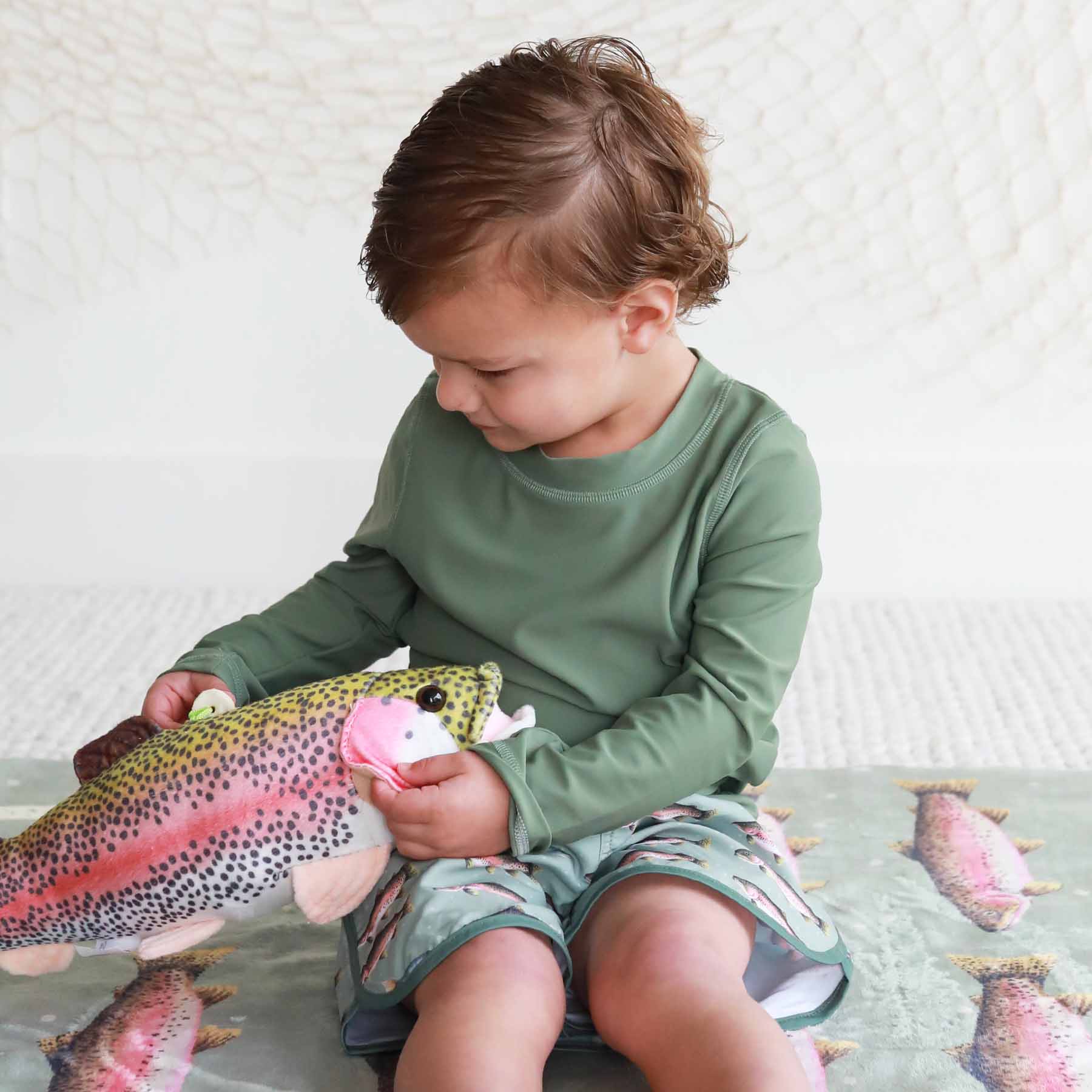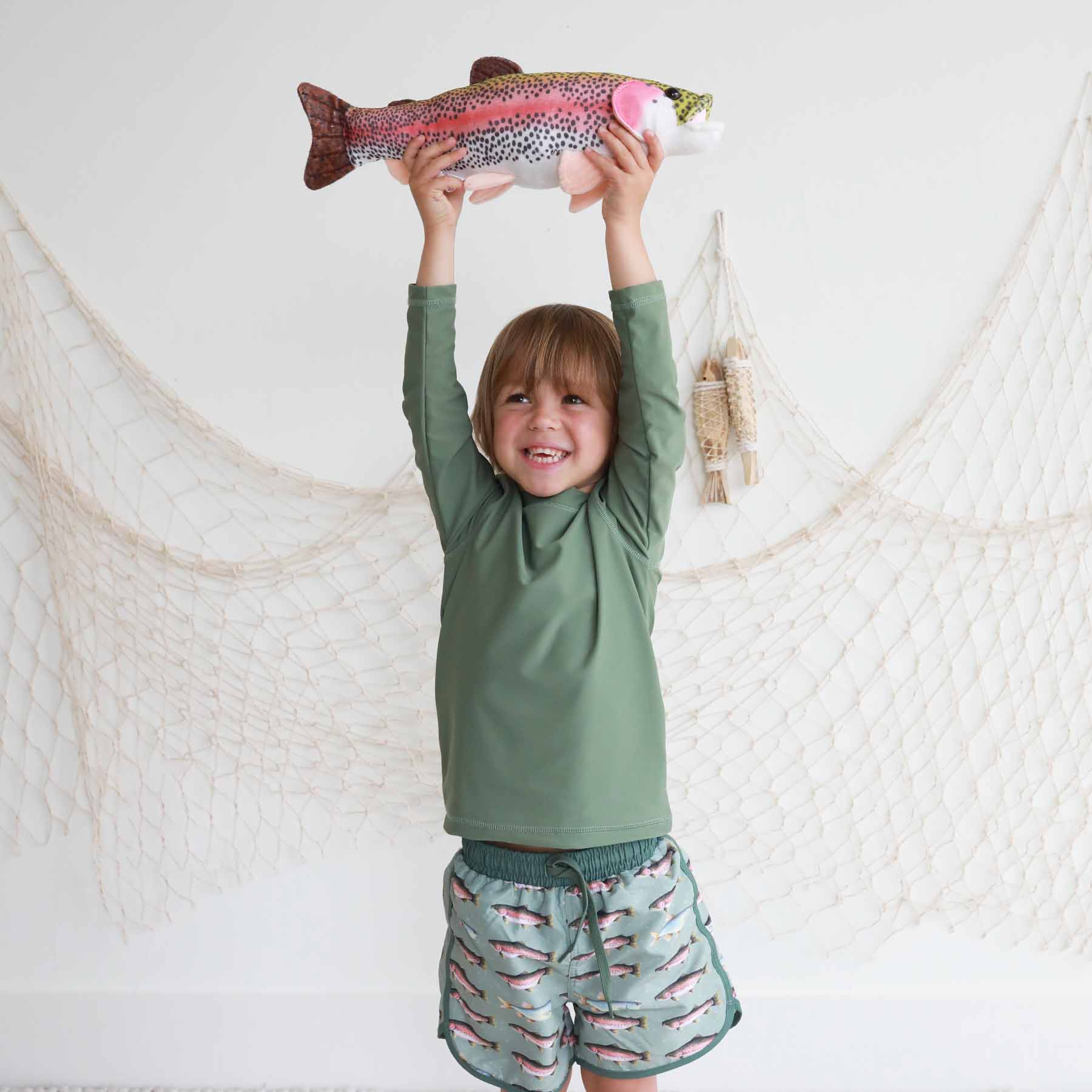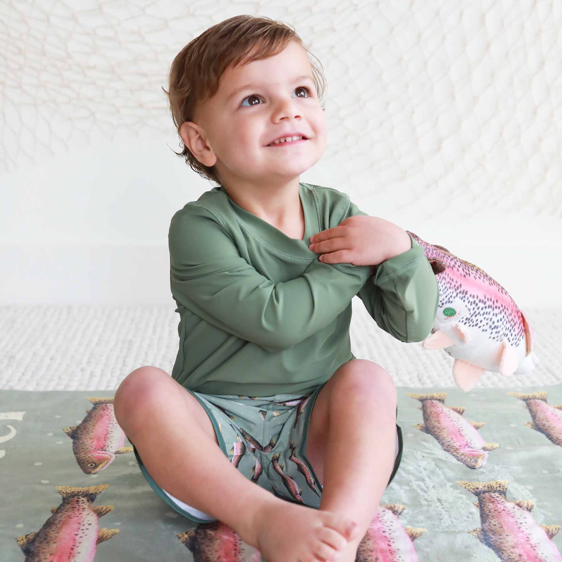 Made from UPF 50+ fabric that blocks 98% of the sun's harmful UVA & UVB rays, this long sleeve rash guard shirt is your little angler's first and only line of defense needed to be protected from the sun! Coming in a dark moss green color that perfectly matches our "Freshwater Friends" swim trunks, this will be a rash guard shirt that your little one will be excited to put on for every fishing adventure or trip to the beach. This silky smooth rash guard will be a swim shirt that your little fisherman will love to slip on before all of his water adventures, minimizing fighting over sunscreen and maximizing time spent in the sun!