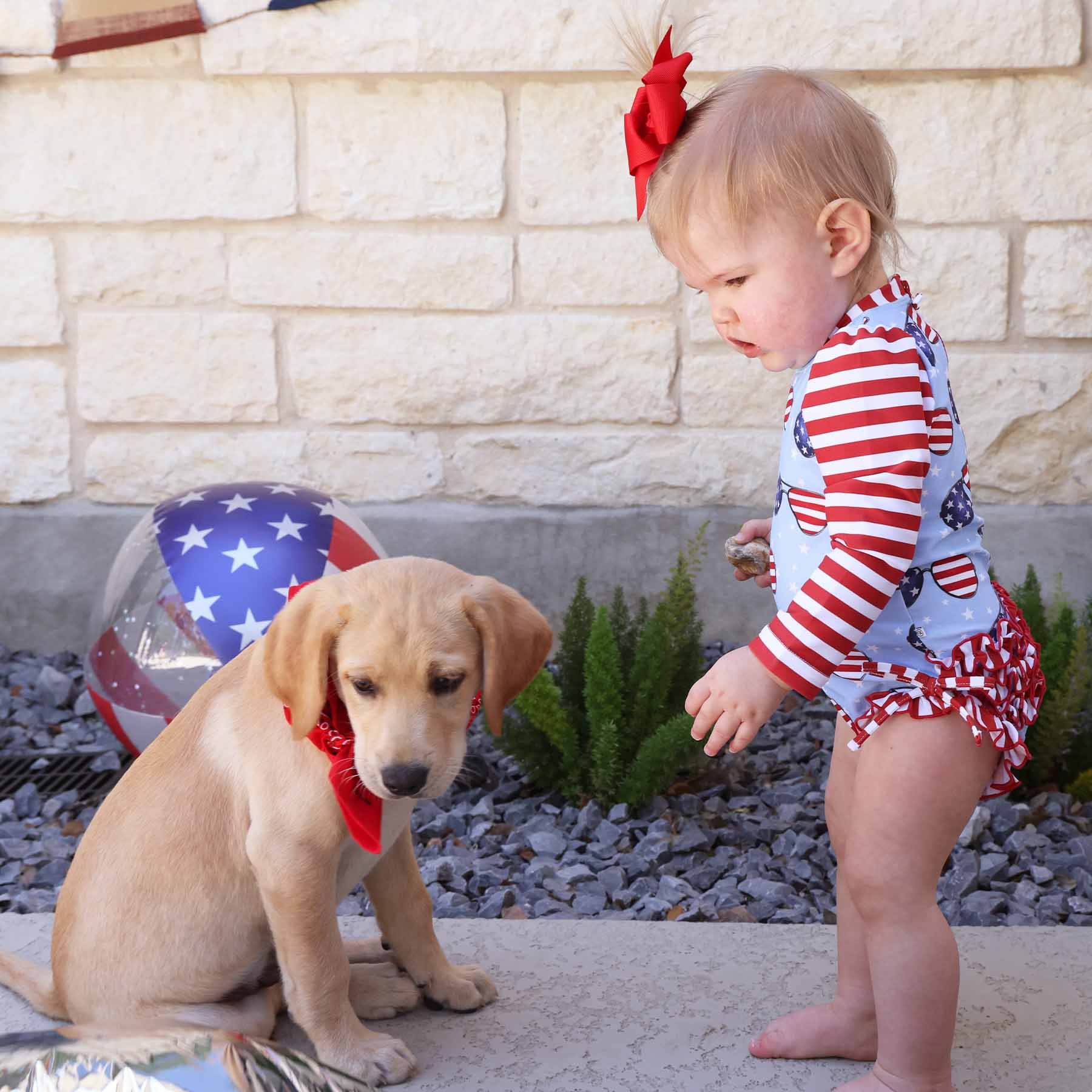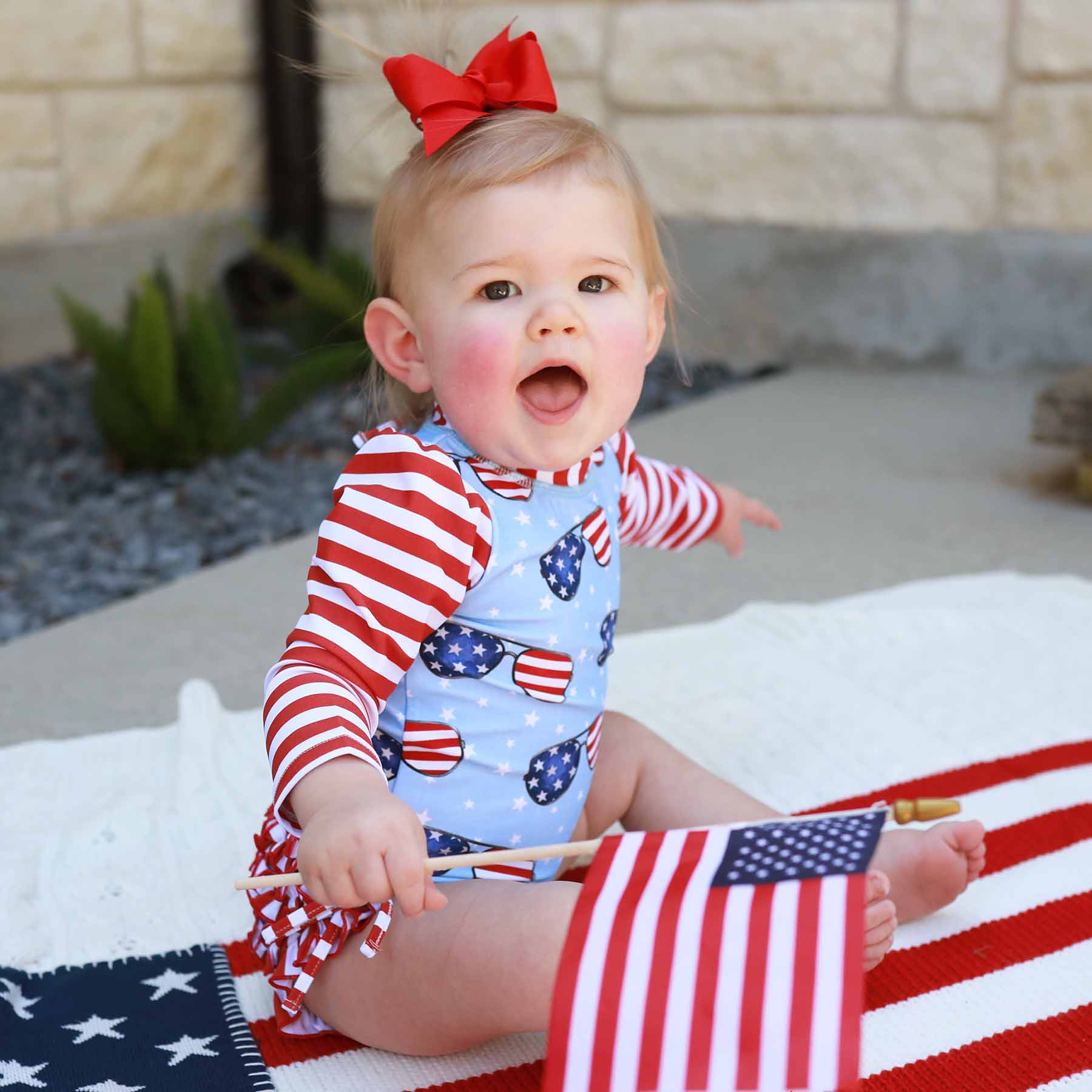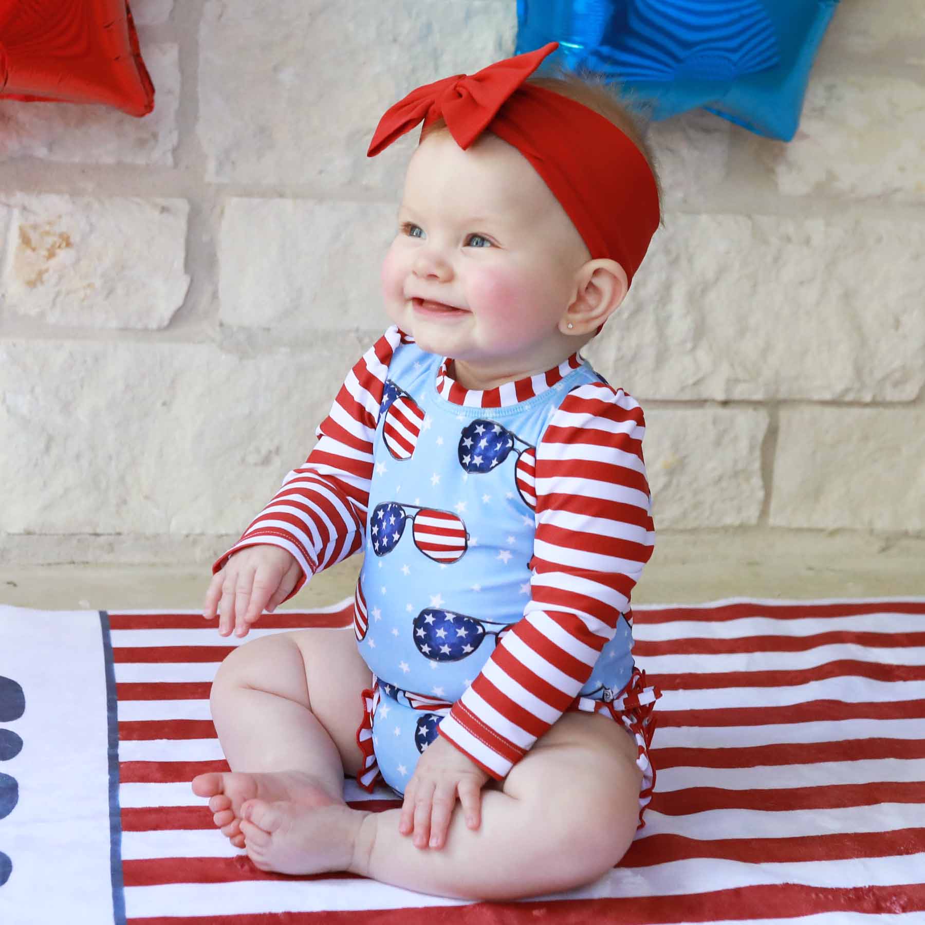 This long-sleeve rash guard with adorable ruffles on the bottom will make your baby the cutest little patriot at the beach or pool this 4th of July! The back zipper and convenient bottom snaps will make changing a breeze, so your baby will not have to miss out on any of the fun during her 4th of July celebration. Our UPF 50+ fabric will keep your baby's delicate skin protected from the sun's harmful rays, minimizing sunburns and maximizing time spent celebrating America's birthday!