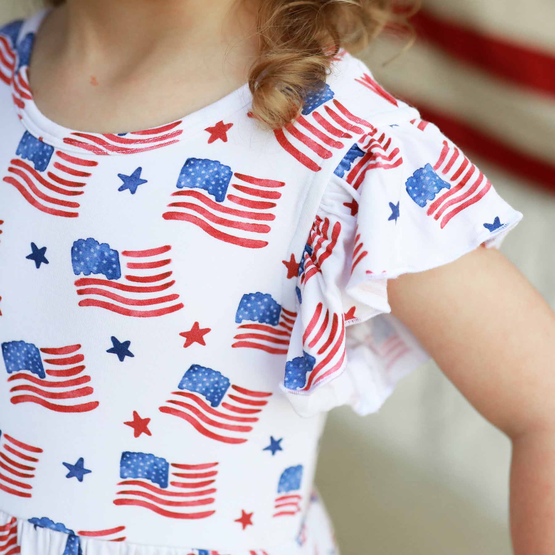 Made for twirling and showing off love of the USA, this dress featuring high-flying flags is the cutest casual dress for any little patriot! Designed from soft and lightweight bamboo fabric, this dress is a dream to wear for warm summer days, keeping your little one comfortable throughout every 4th of July picnic or backyard barbecue. Matching the entire American Dreams collection, this dress is the perfect look for any girl wanting to match with the whole family while showing off her love for the red, white and blue!